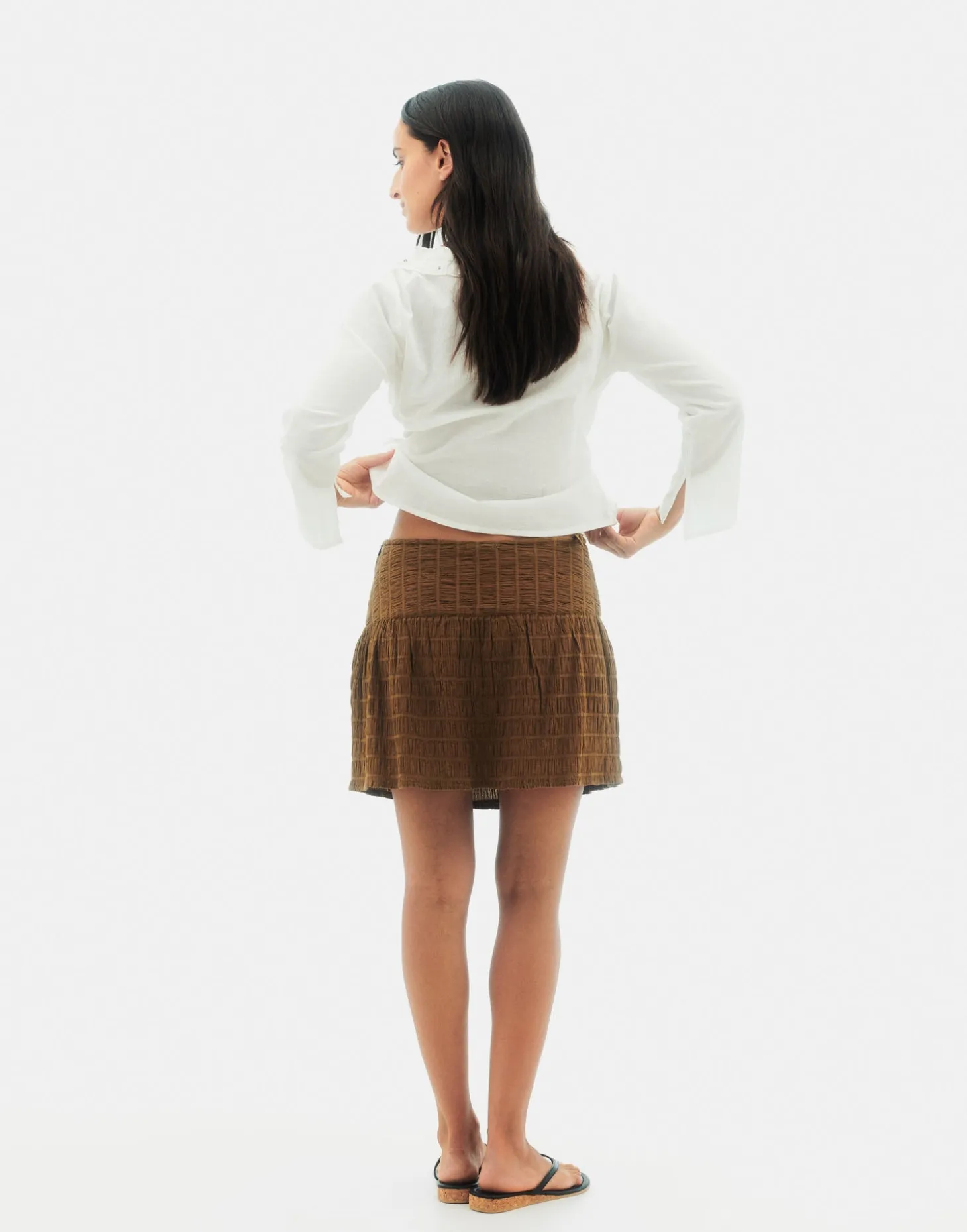 Falda corta de algodón con detalle de tejido en relieve y lazo frontal. Cierre con cremallera lateral oculta en costura.