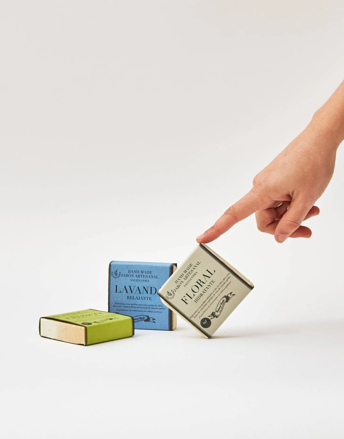 Jabón al corte hecho artesanalmente por personas en riesgo de exclusión social. Contienen aceite de oliva y coco, manteca de karité, aloe vera y esencias naturales.