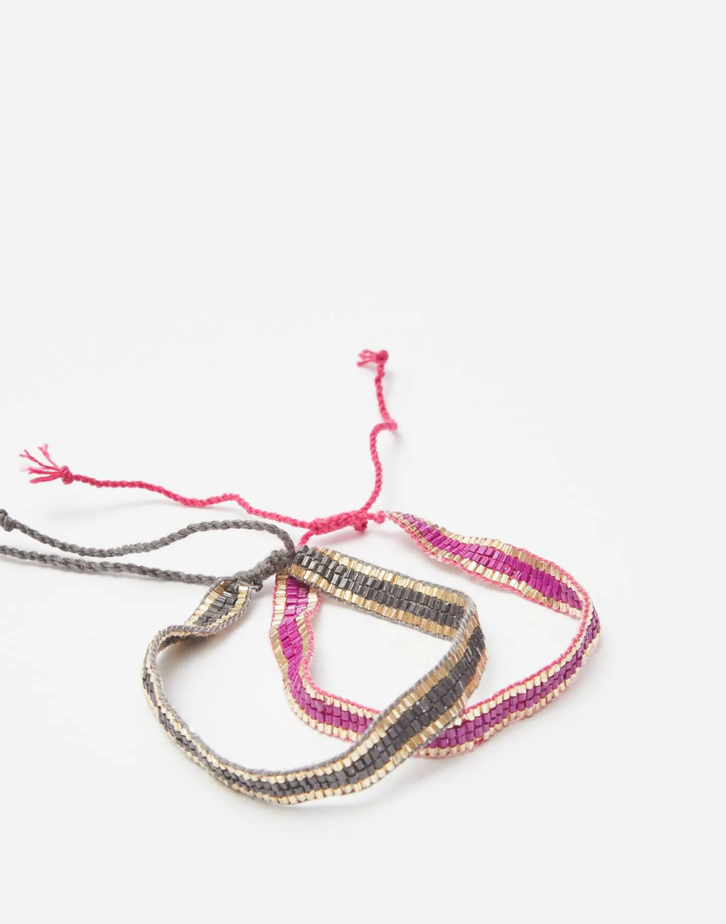Pack de 2 pulseras anchas con cuentas de colores acabadas en ribete dorado. Cierre de nudo corredizo.
