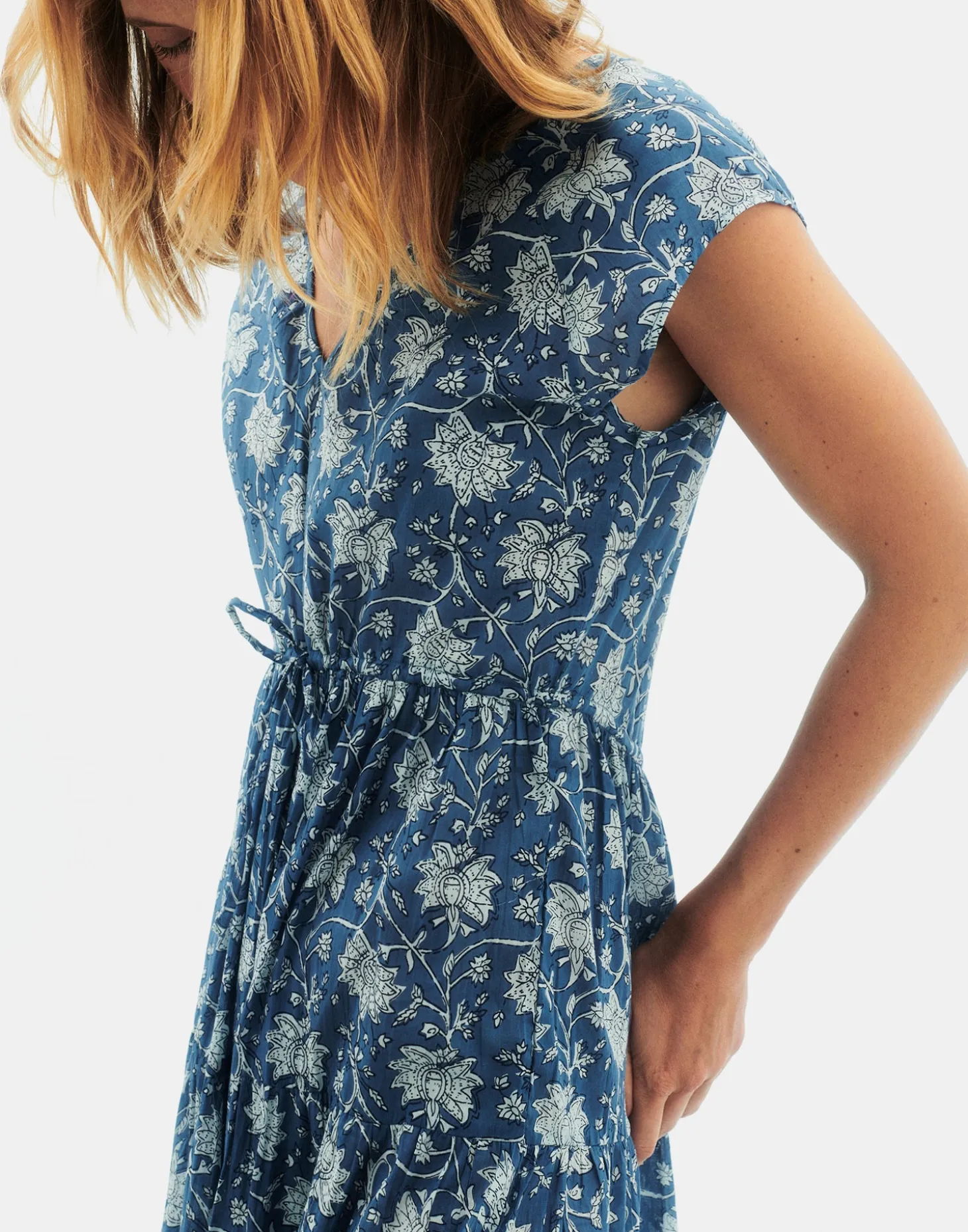 Vestido largo fluido con escote de pico y manga sisa. Detalle de volantes, estampado floral y cintura ajustable mediante lazo.