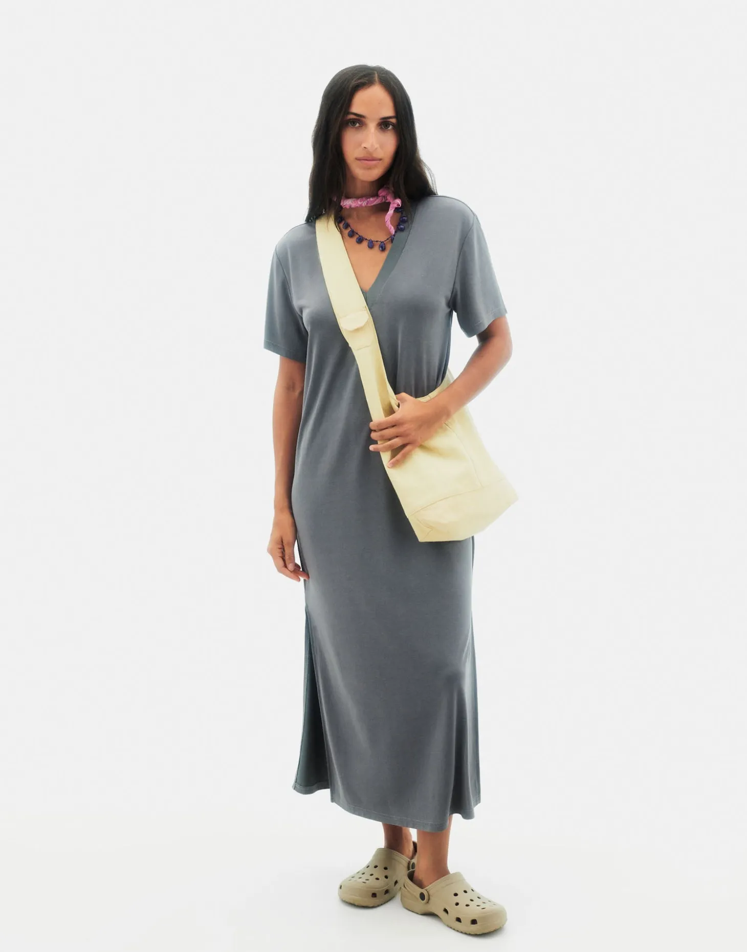 Vestido largo de manga corta y escote de pico, con aperturas laterales en el bajo.