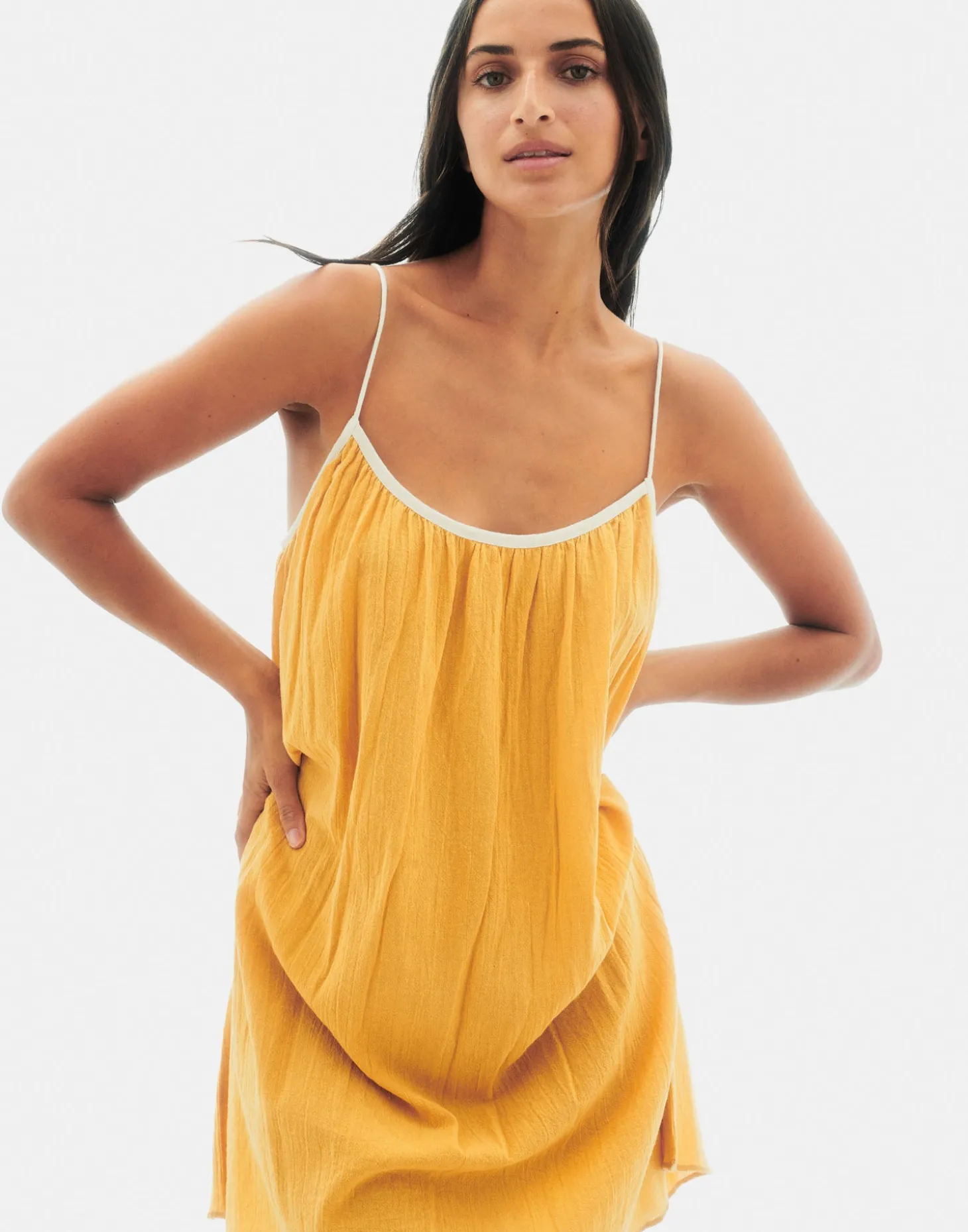 Vestido corto de tirantes con escote redondo y detalles plisados.