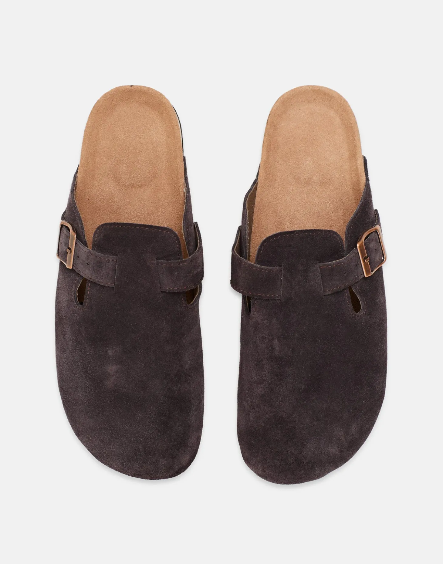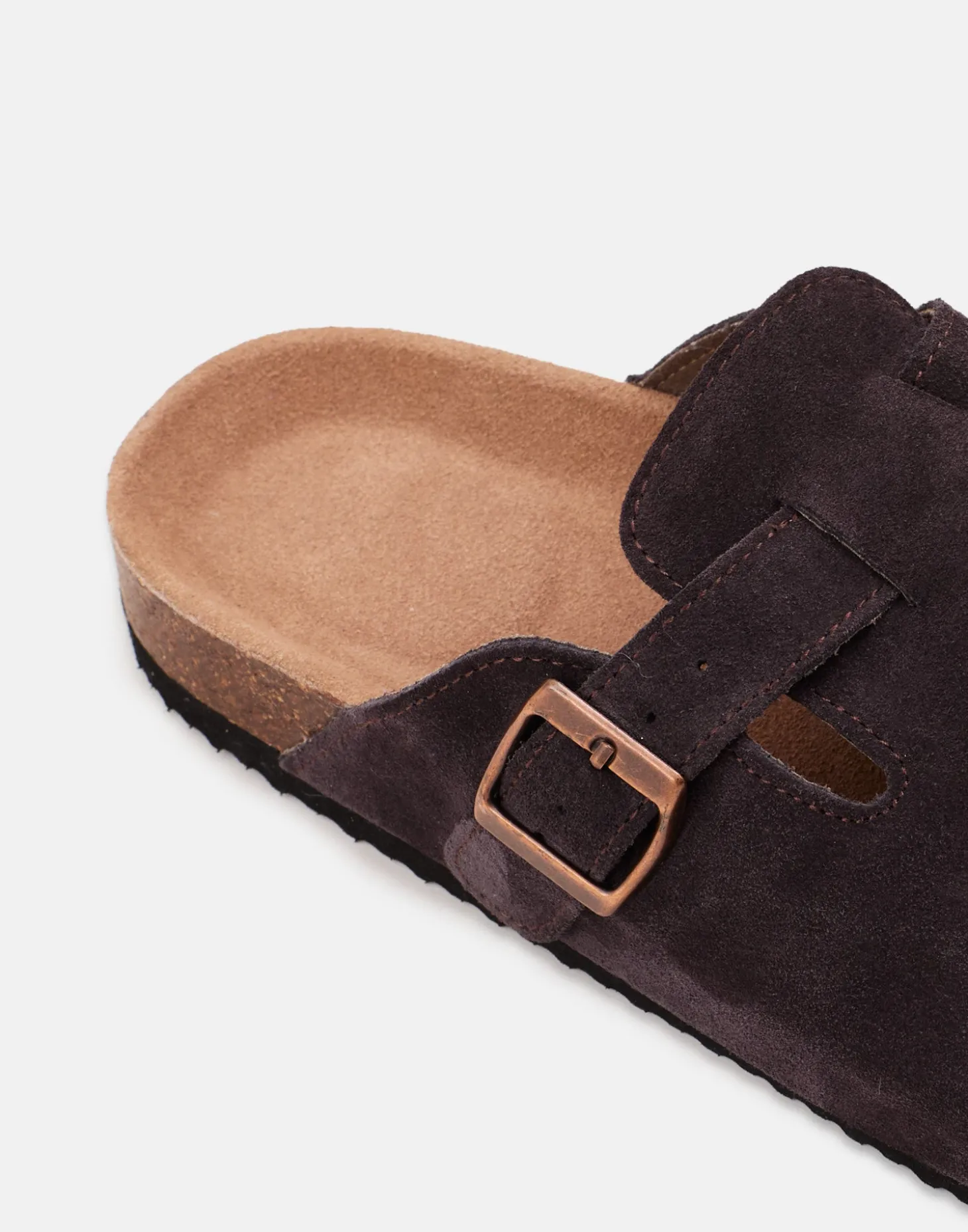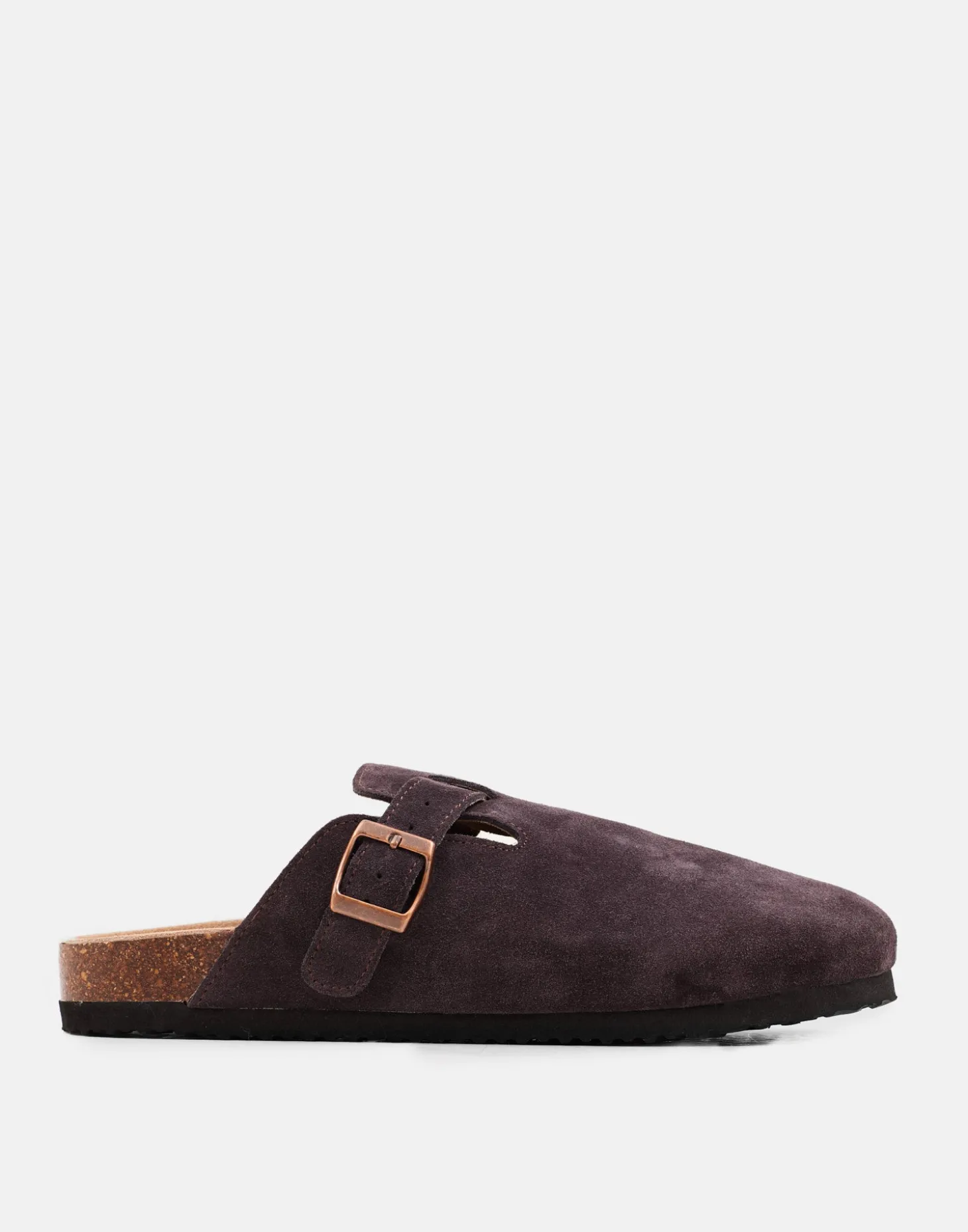 Zapato tipo zueco para hombre con diseño destalonado, corte de piel de serraje y suela de corcho. Detalle de hebilla en el corte.