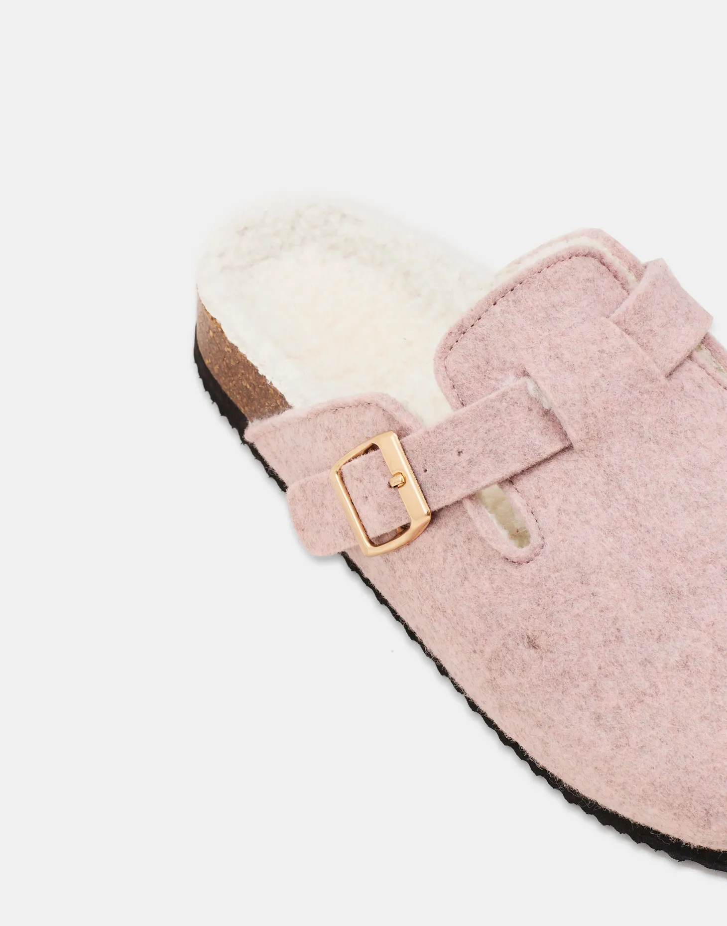 Zueco de fieltro y forro interior calentito. Con detalle de hebilla y suela de corcho.