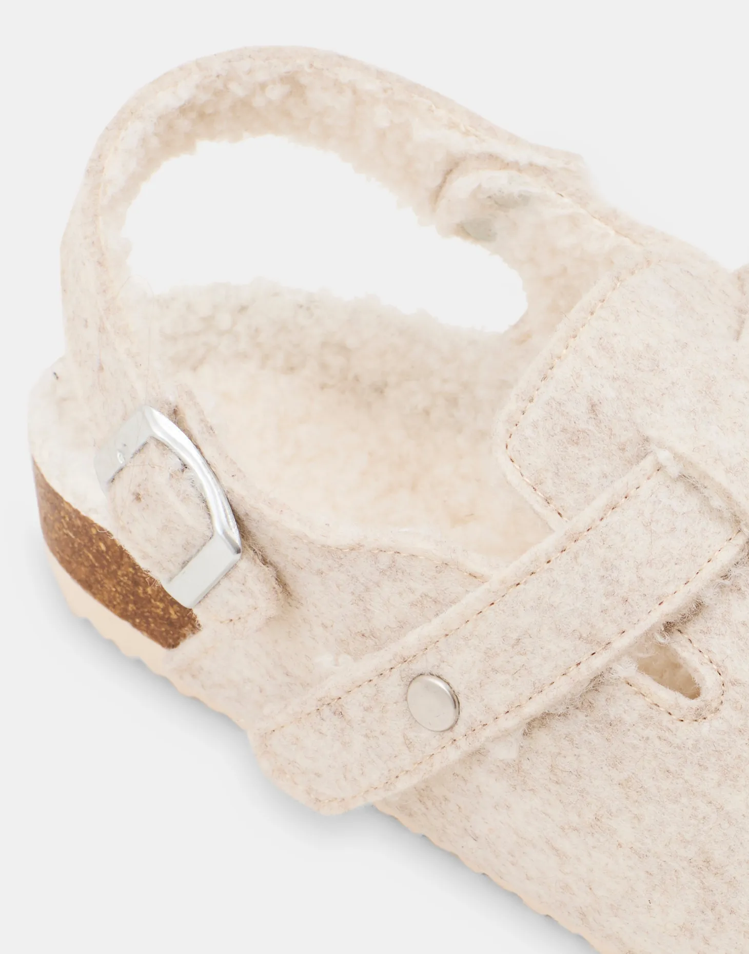 Zueco de fieltro y forro interior calentito de borrego. Con detalle de hebilla en la parte del tobillo y suela de corcho.
