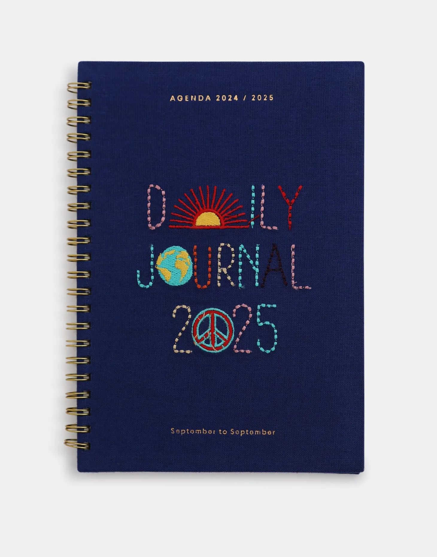 Agenda escolar con organización y visualización semana vista, desde septiembre 2024 a septiembre 2025. Con espiral metálica y encuadernación en lino con texto bordado.