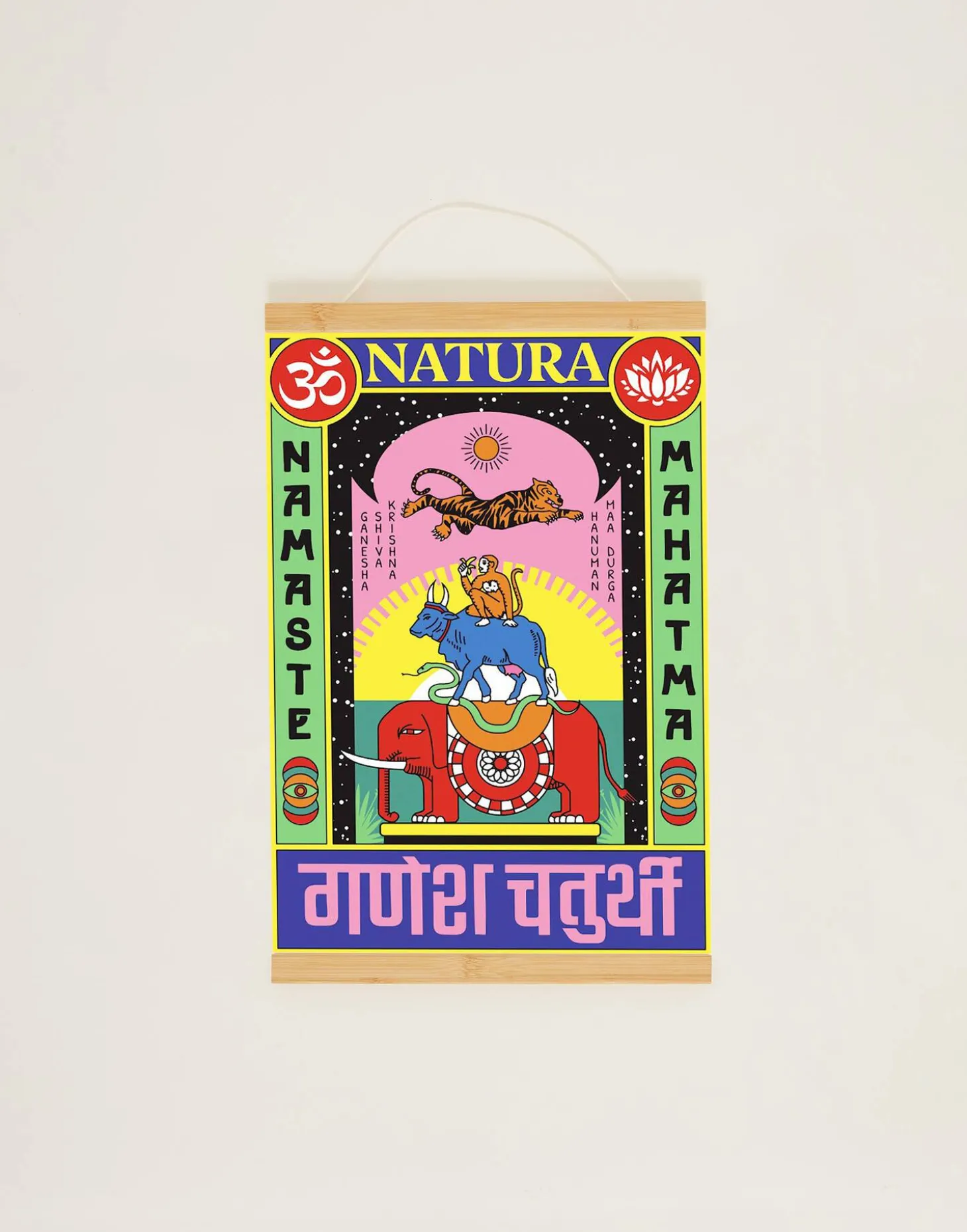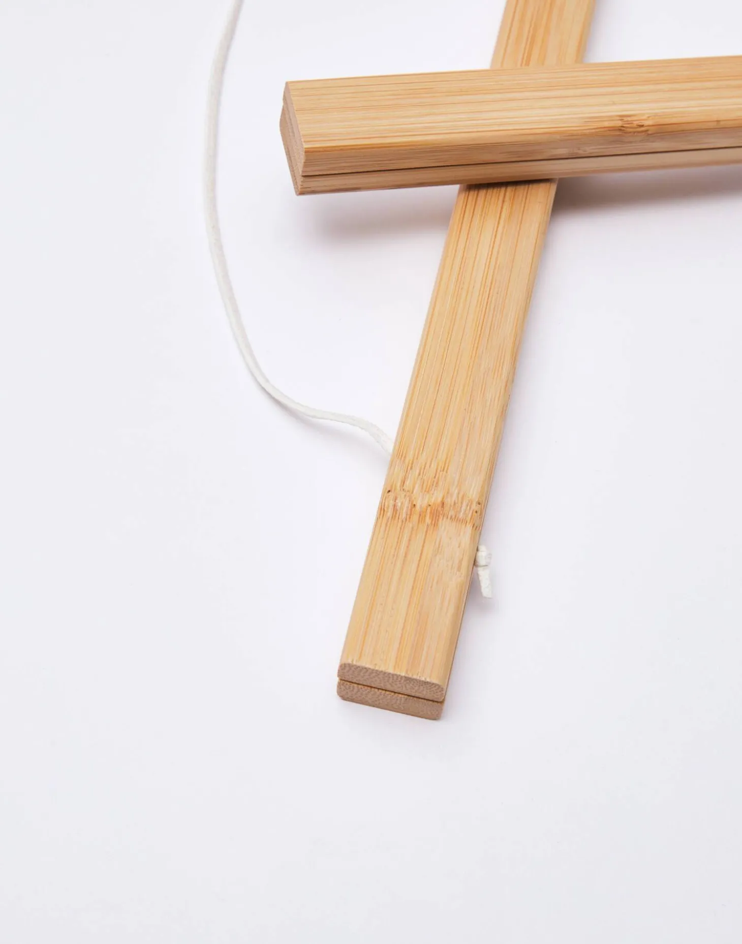 2 tiras de sujeción de bambú para láminas decorativas. Cada una de las tiras está formada por dos piezas que se unen mediante imanes ocultos que también sujetan la láimina. Una de las tiras incorpora una cuerda para colgarlo.