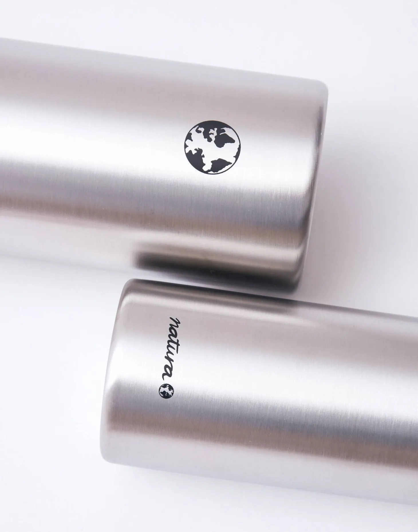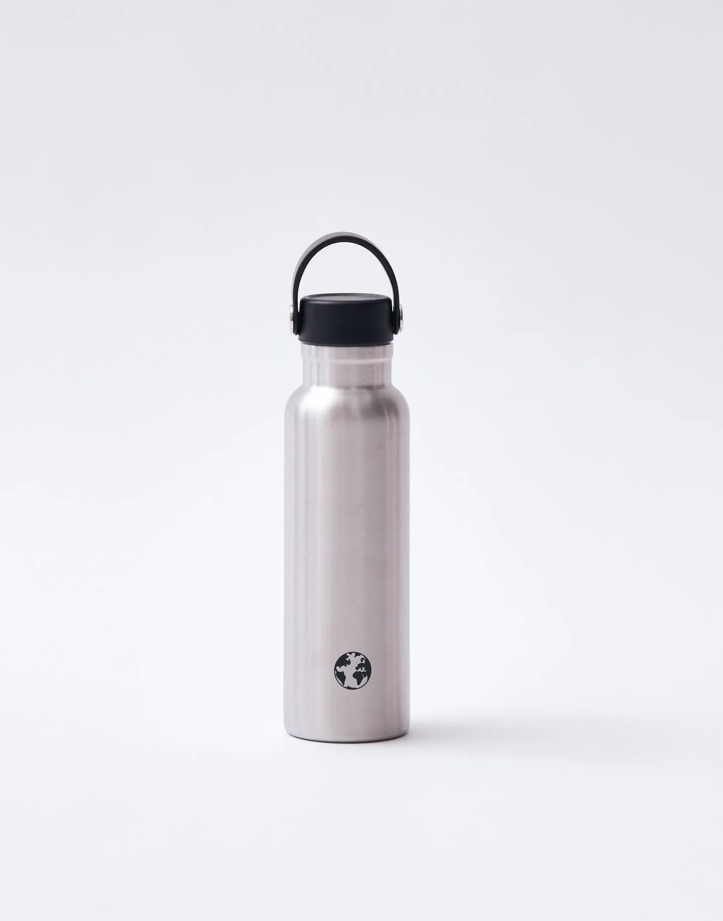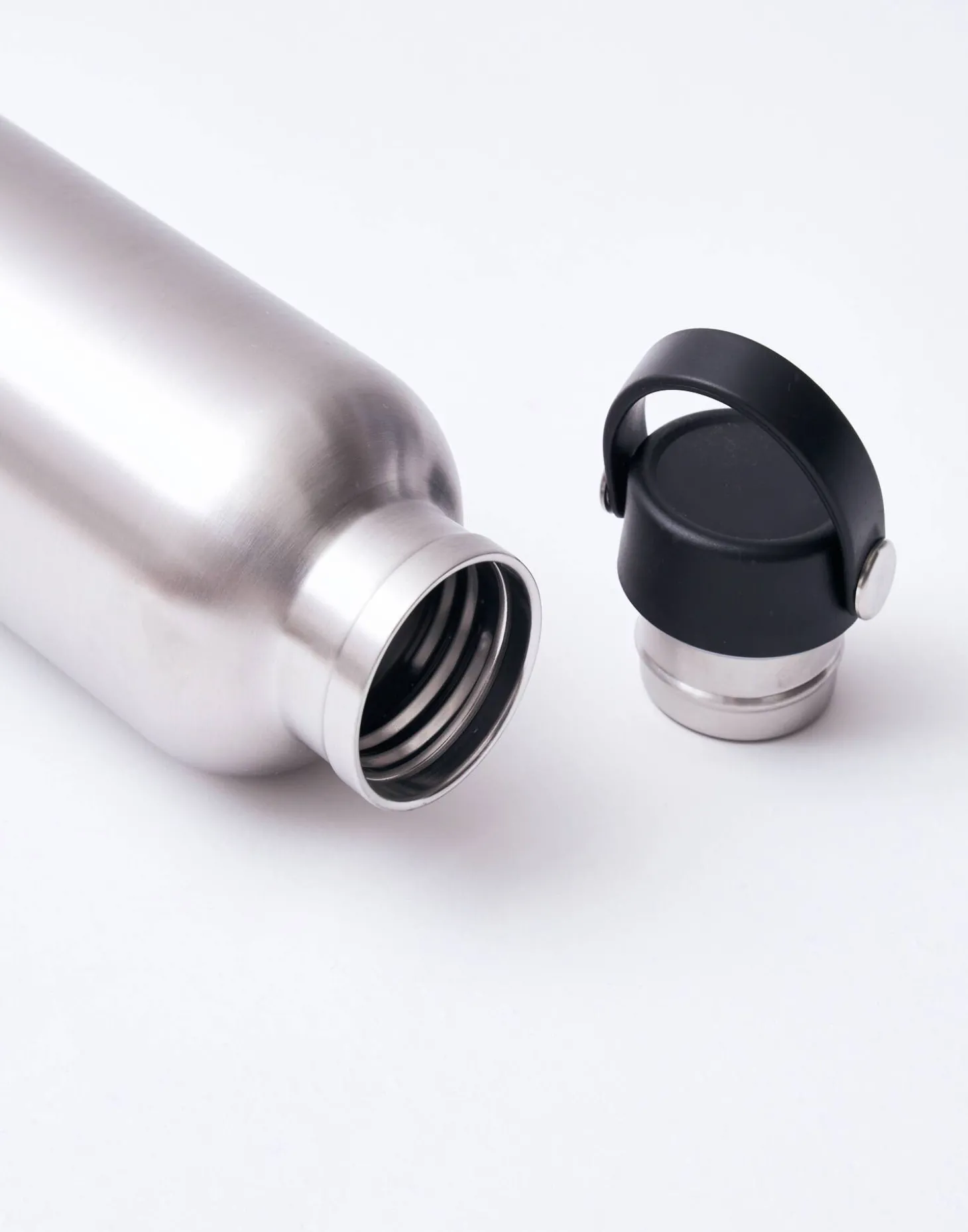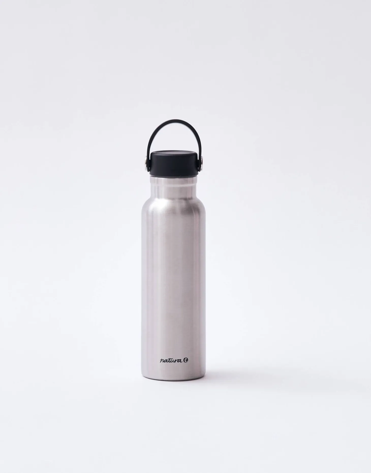 Botella reutilizable de acero inoxidable que puede utilizarse como termo. Acabada en tapón con asa.