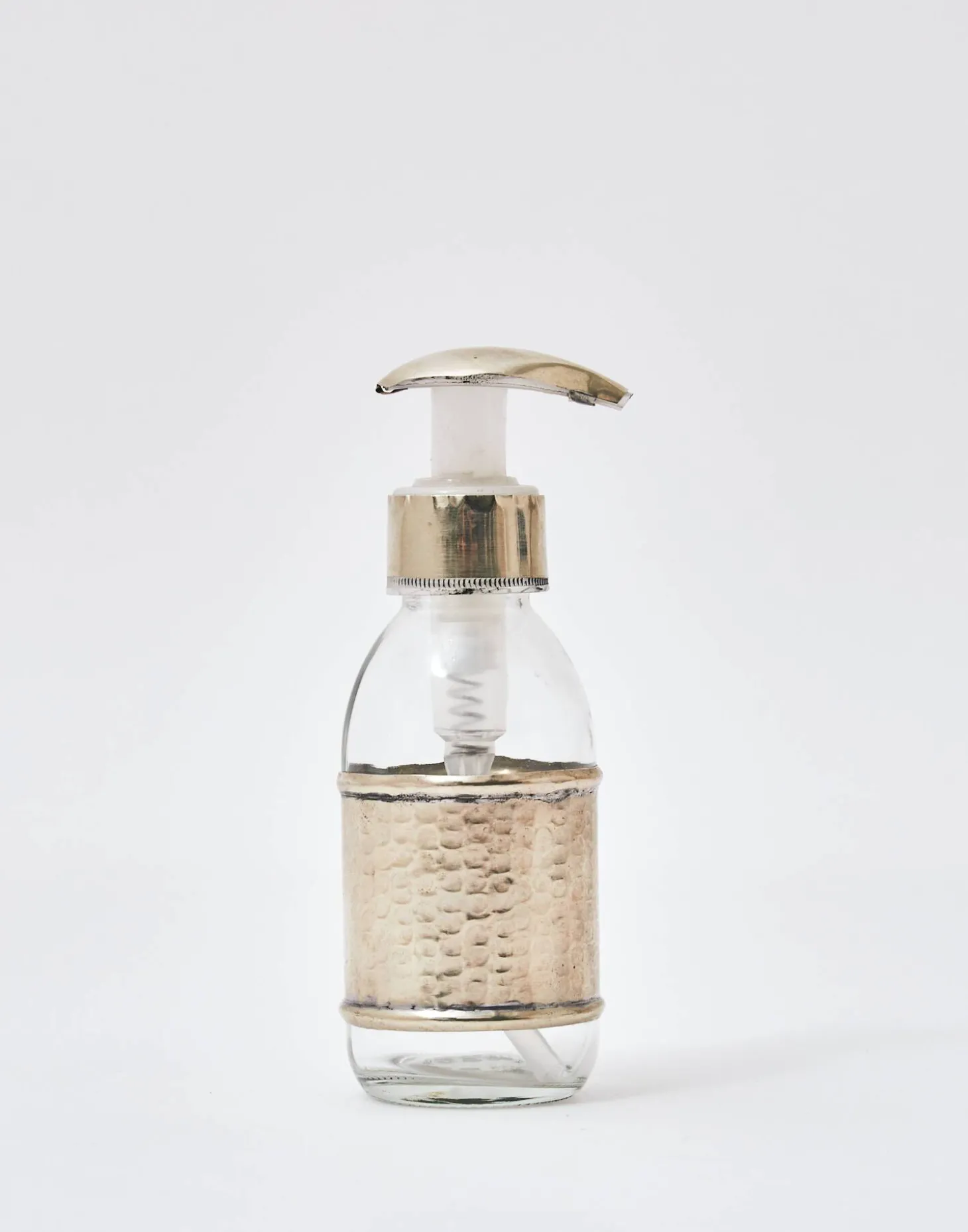 Dosificador de jabón de base redonda realizado en vidrio y latón.