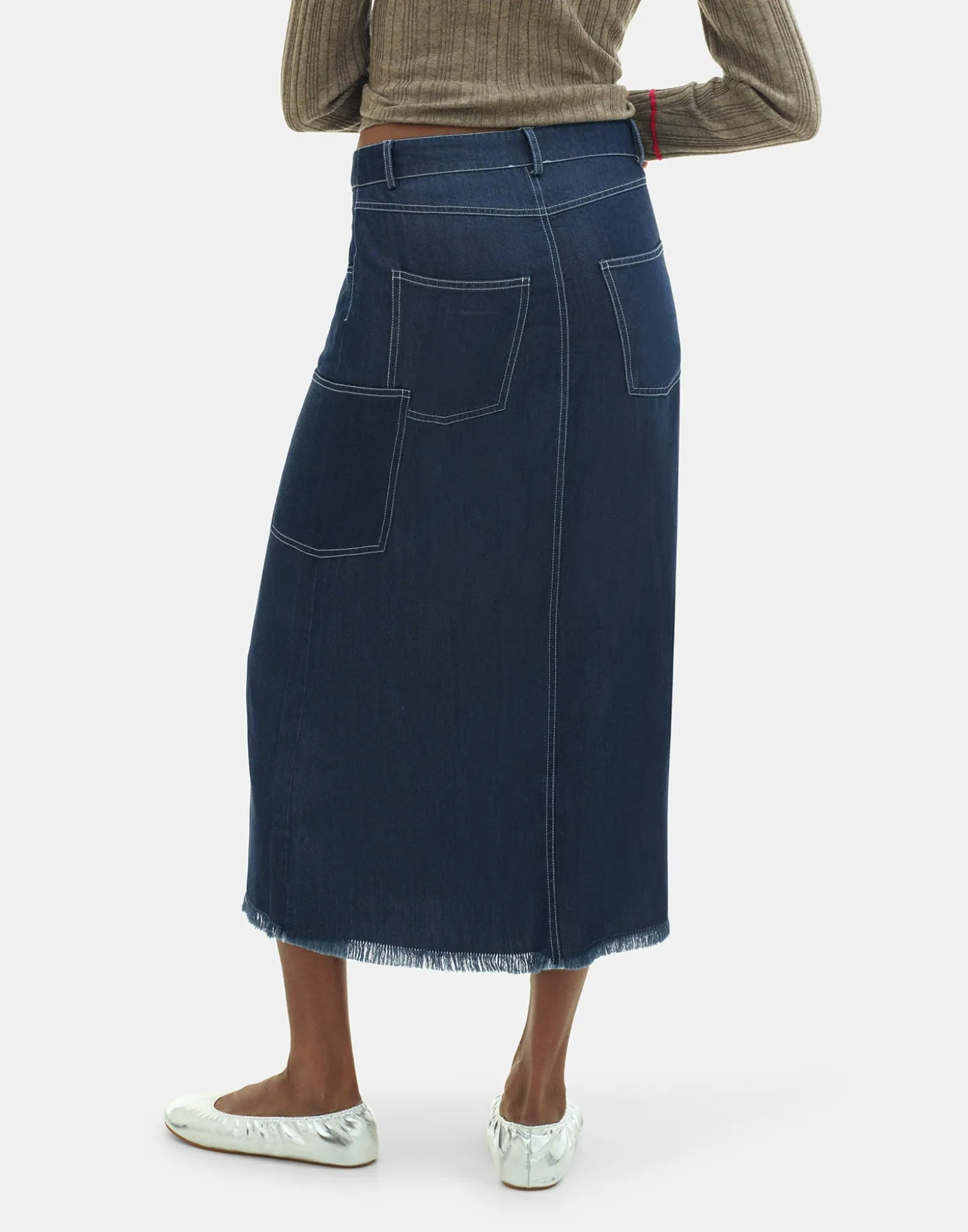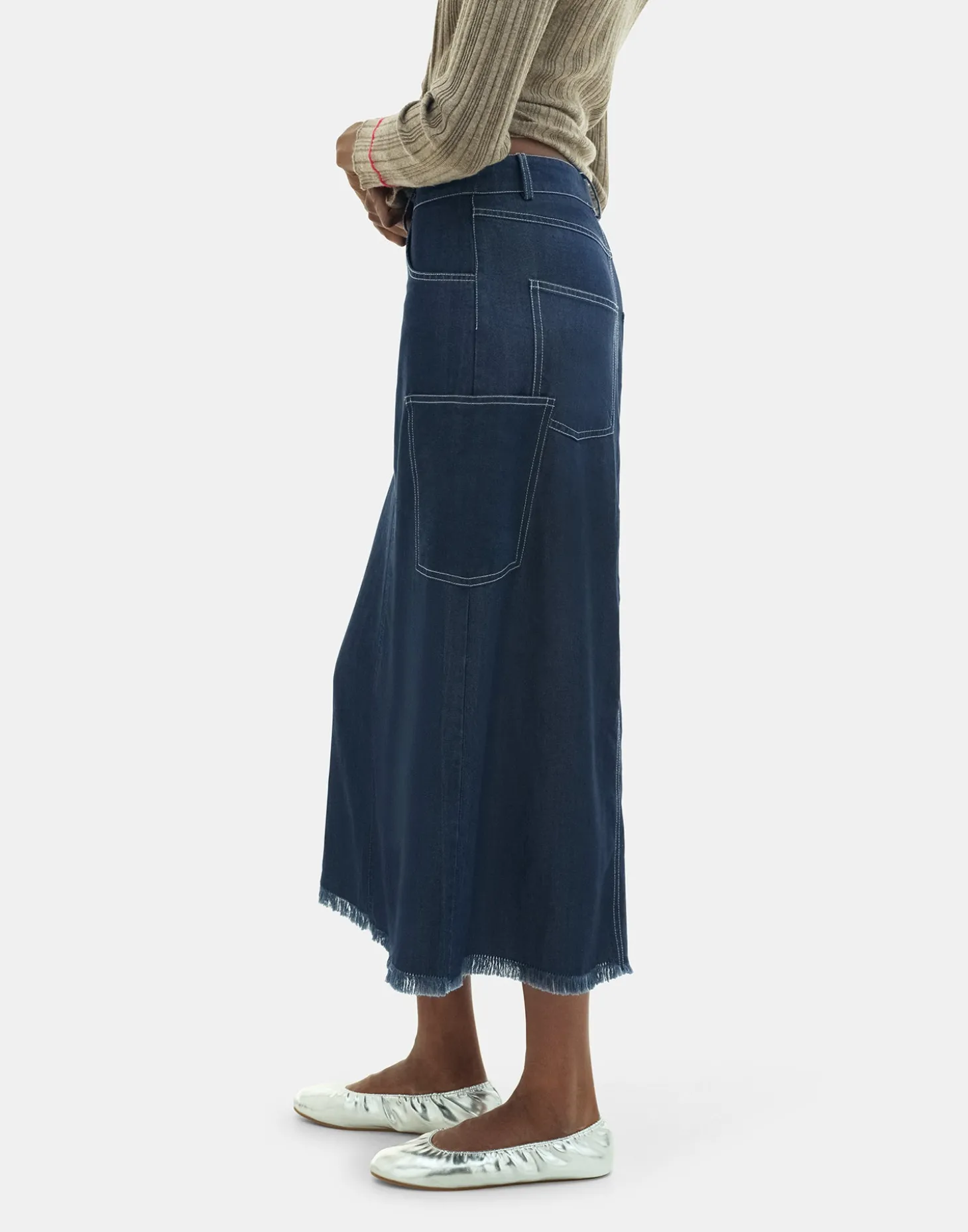 Falda larga denim con cinco bolsillos y bolsillo adicional en el lateral. Cierre frontal de cremallera y botón. Detalle de bajo desflecado.