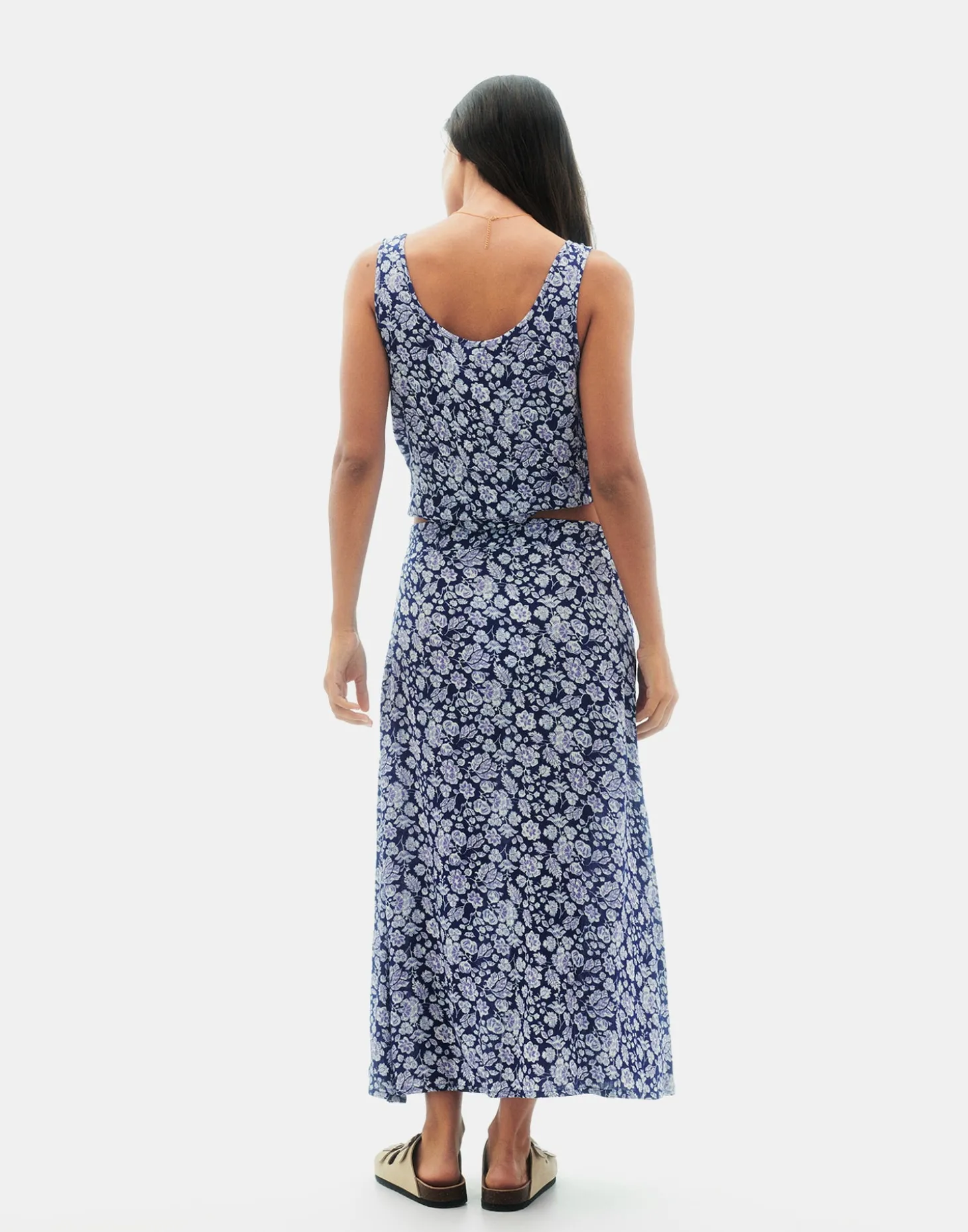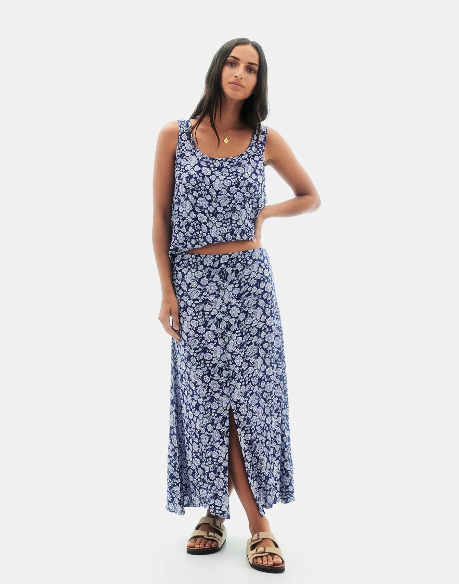 Falda larga con estampado floral y cierre de cremallera en lateral. Acabada con apertura frontal y botones forrados a tono.