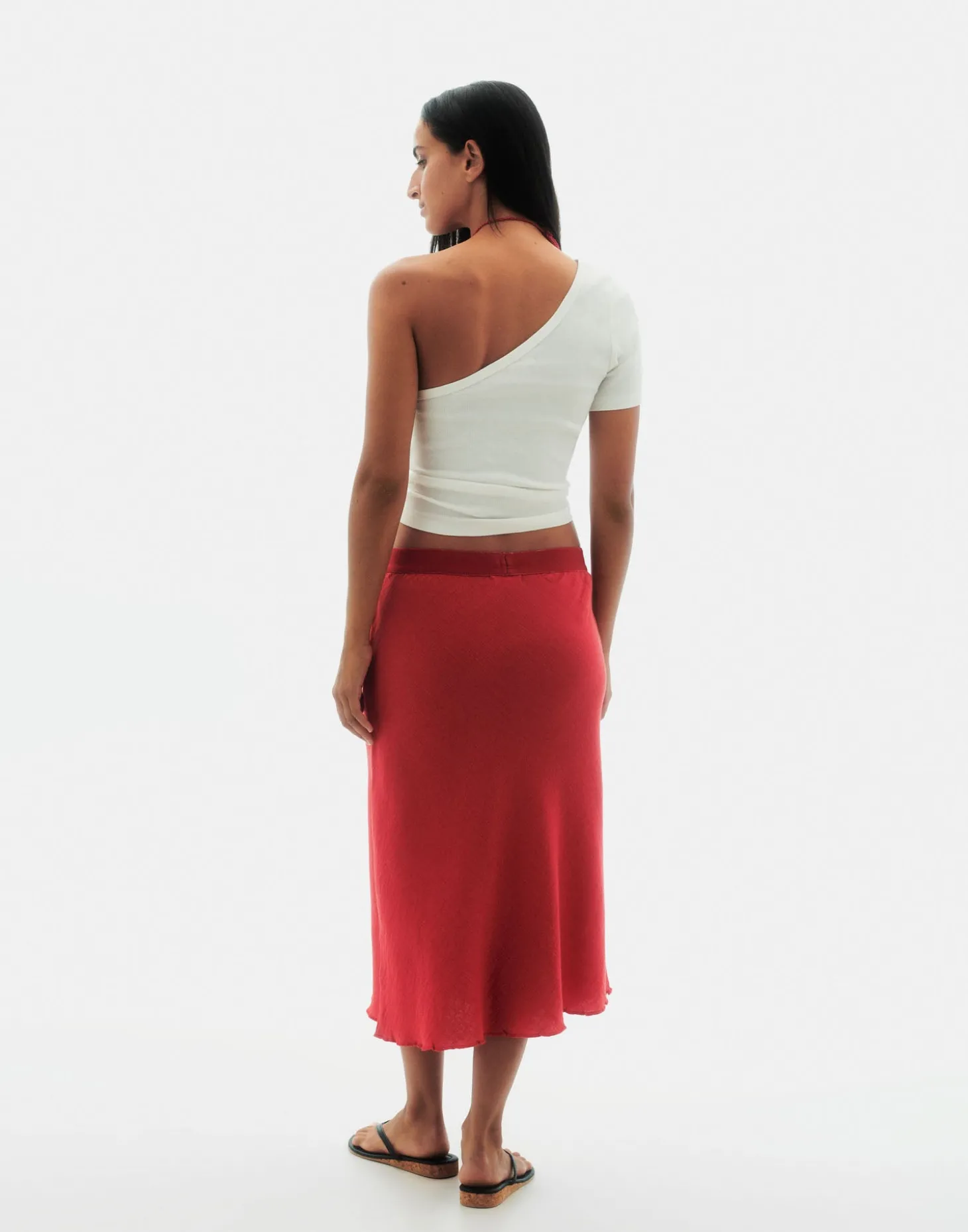 Falda midi con cintura elástica y bajo acabado en línea evasé.