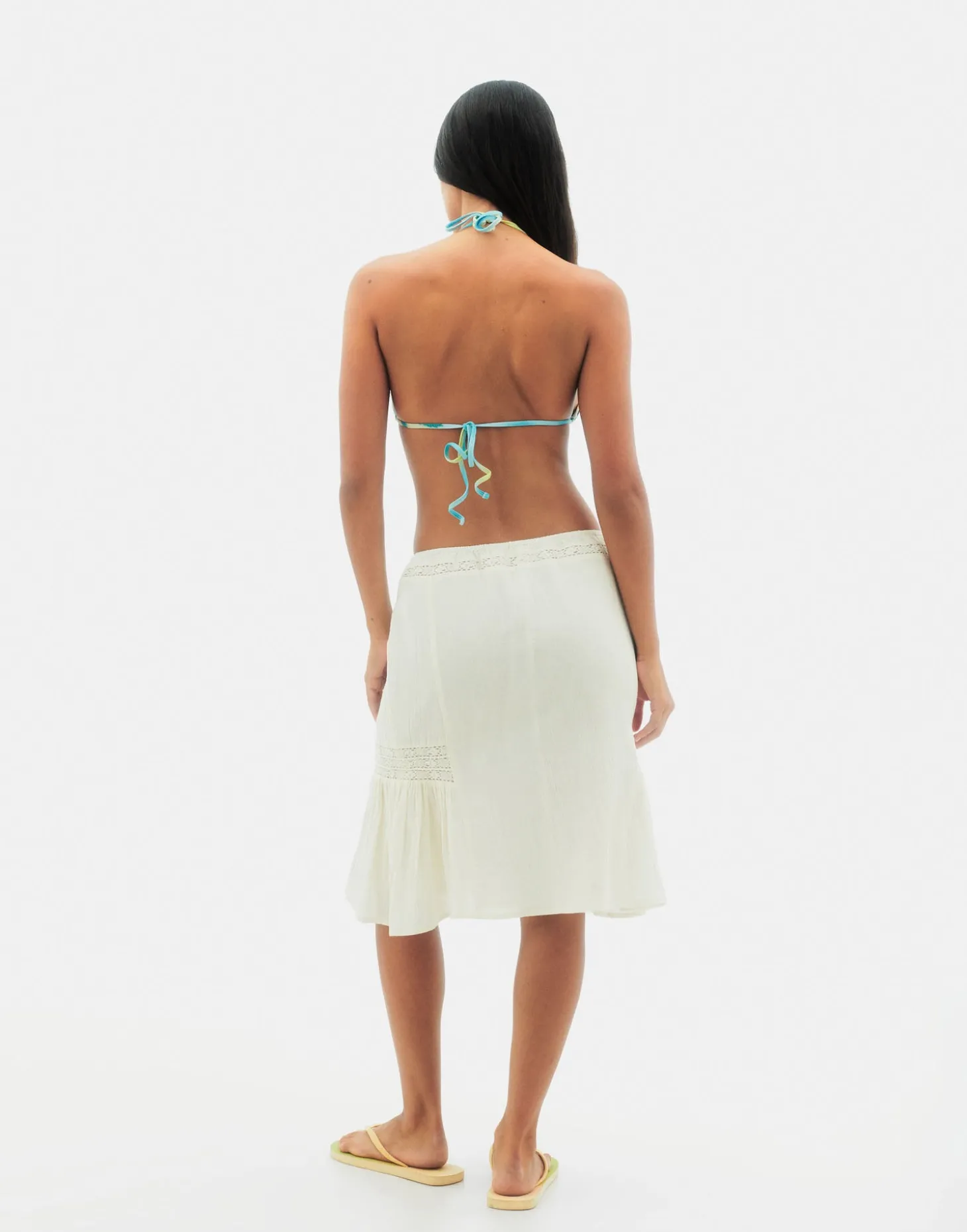 Falda midi de algodón, con cintura elástica, detalle de volantes y aplicación de encaje.