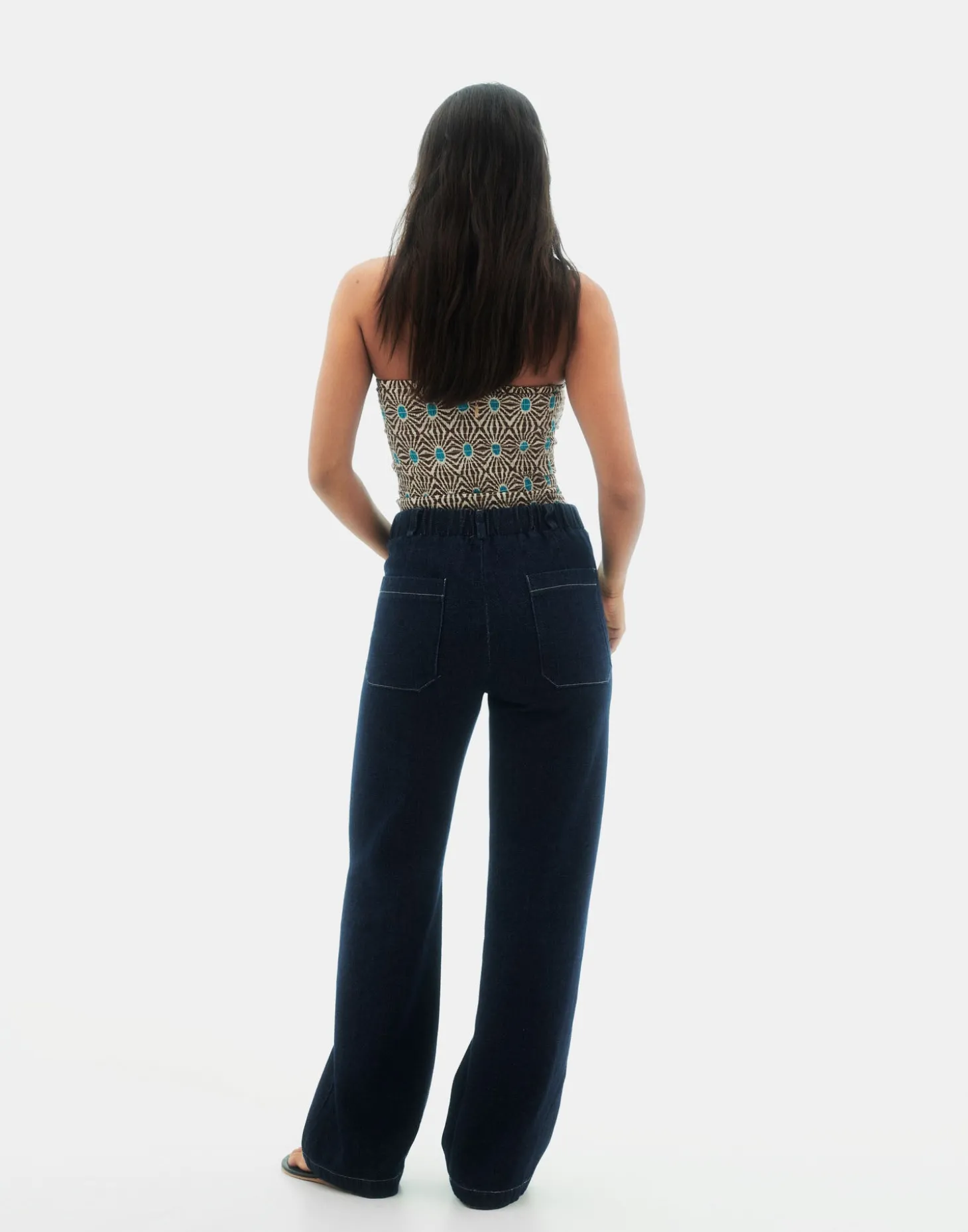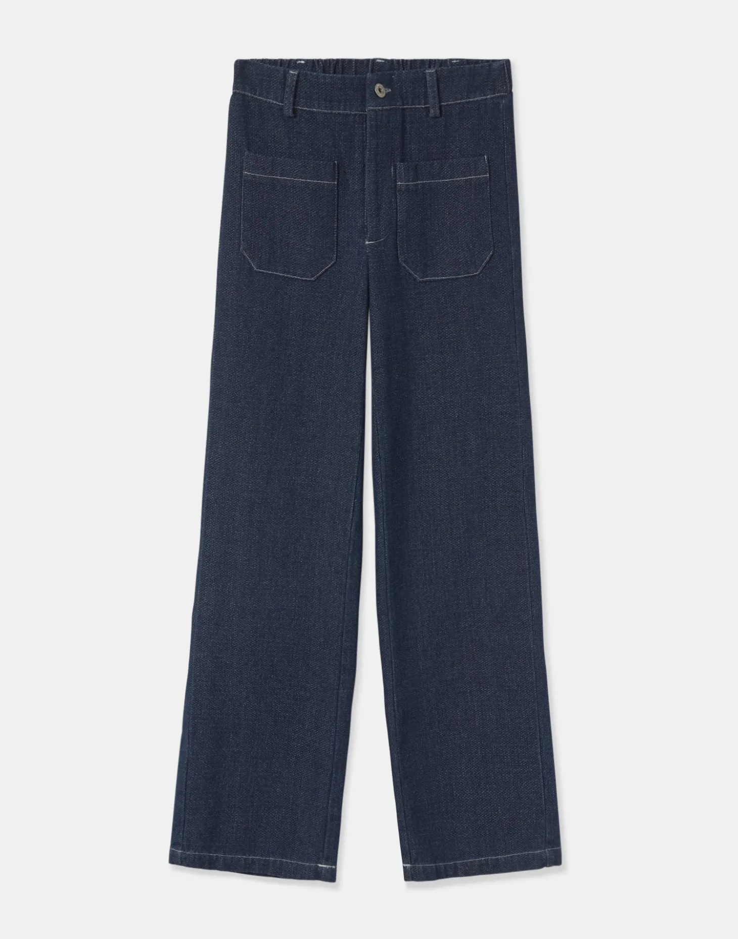 Jeans de corte recto y tiro alto con cierre frontal de botón y cremallera oculta. Bolsillos de plastrón en la parte frontal y en la parte trasera.