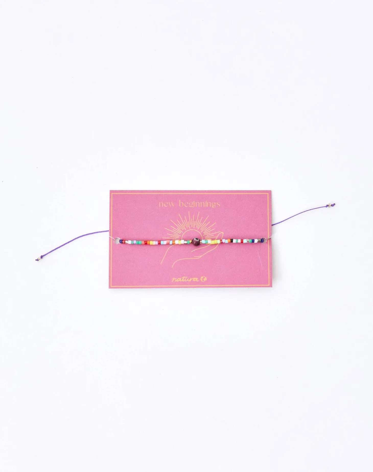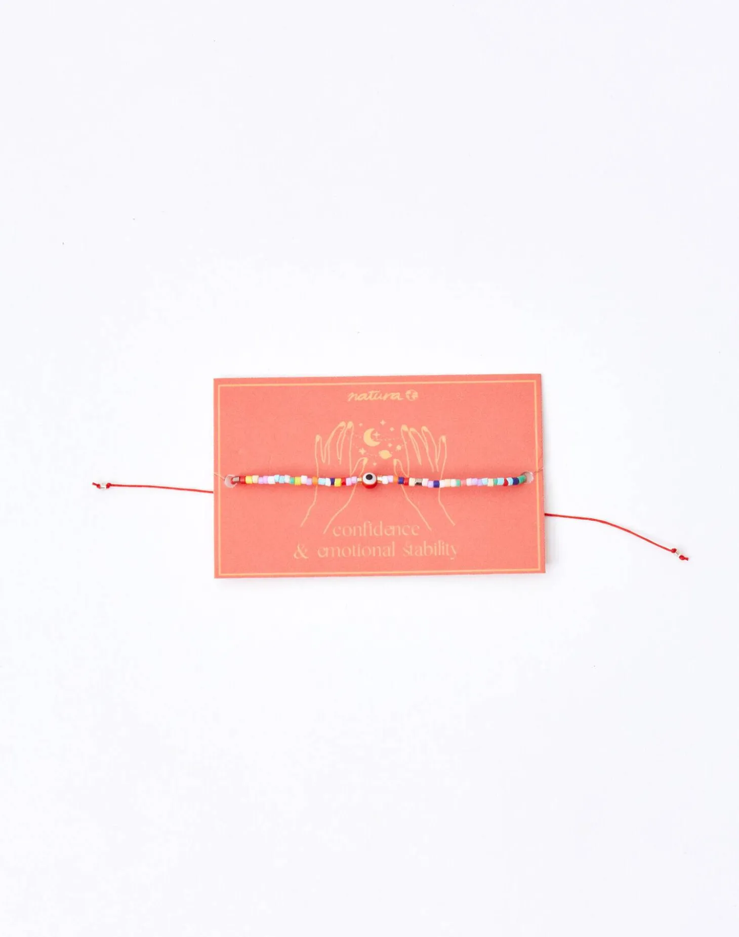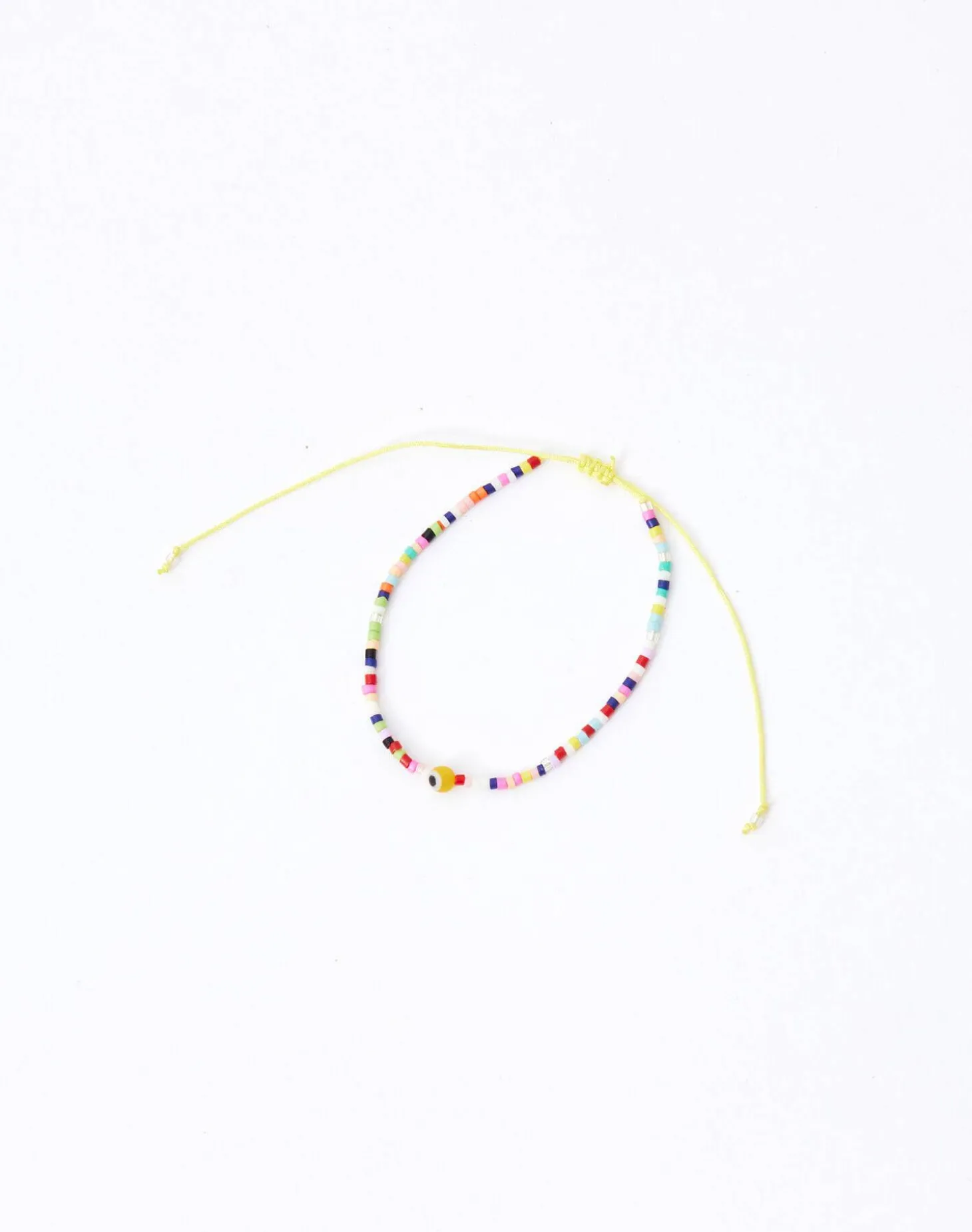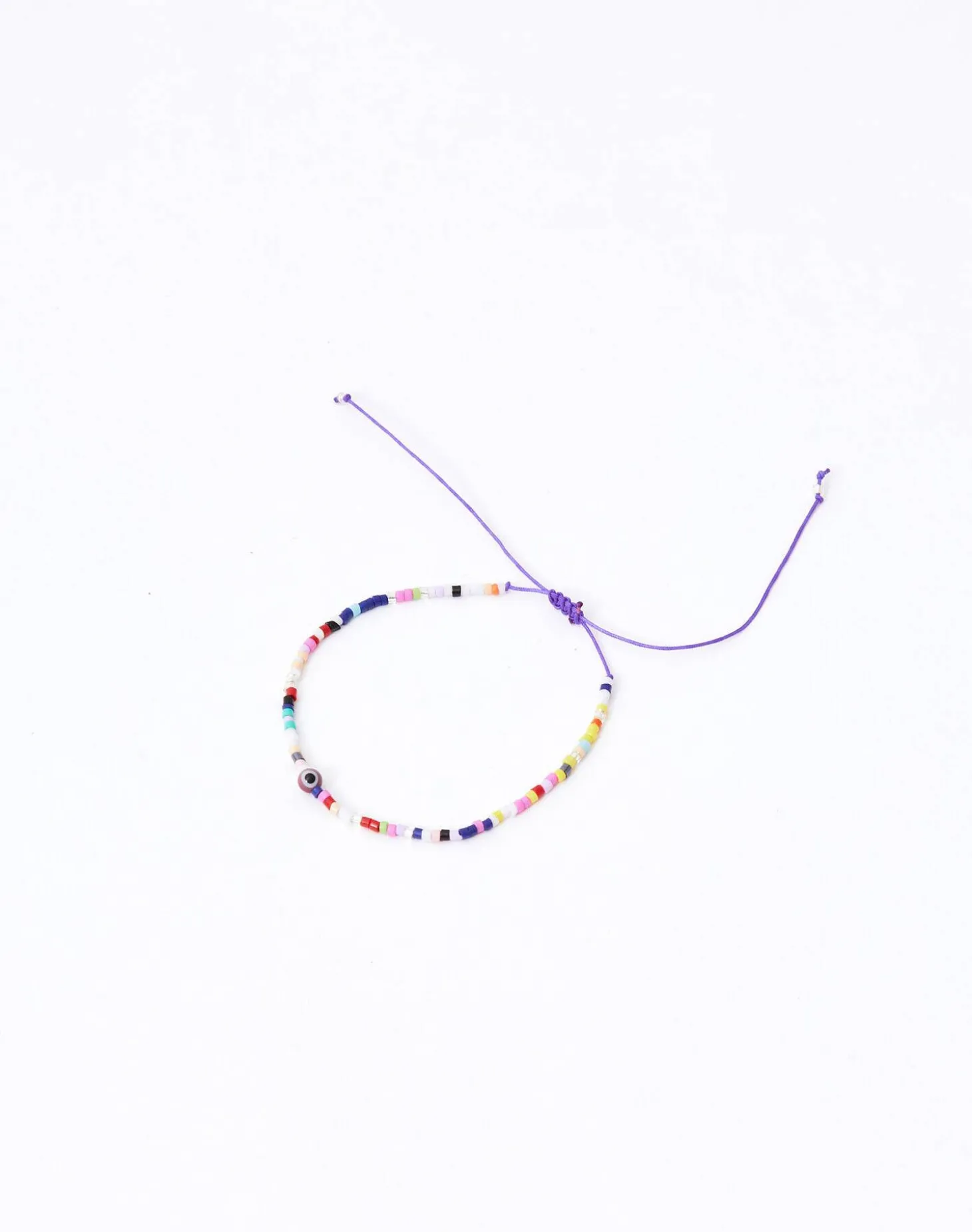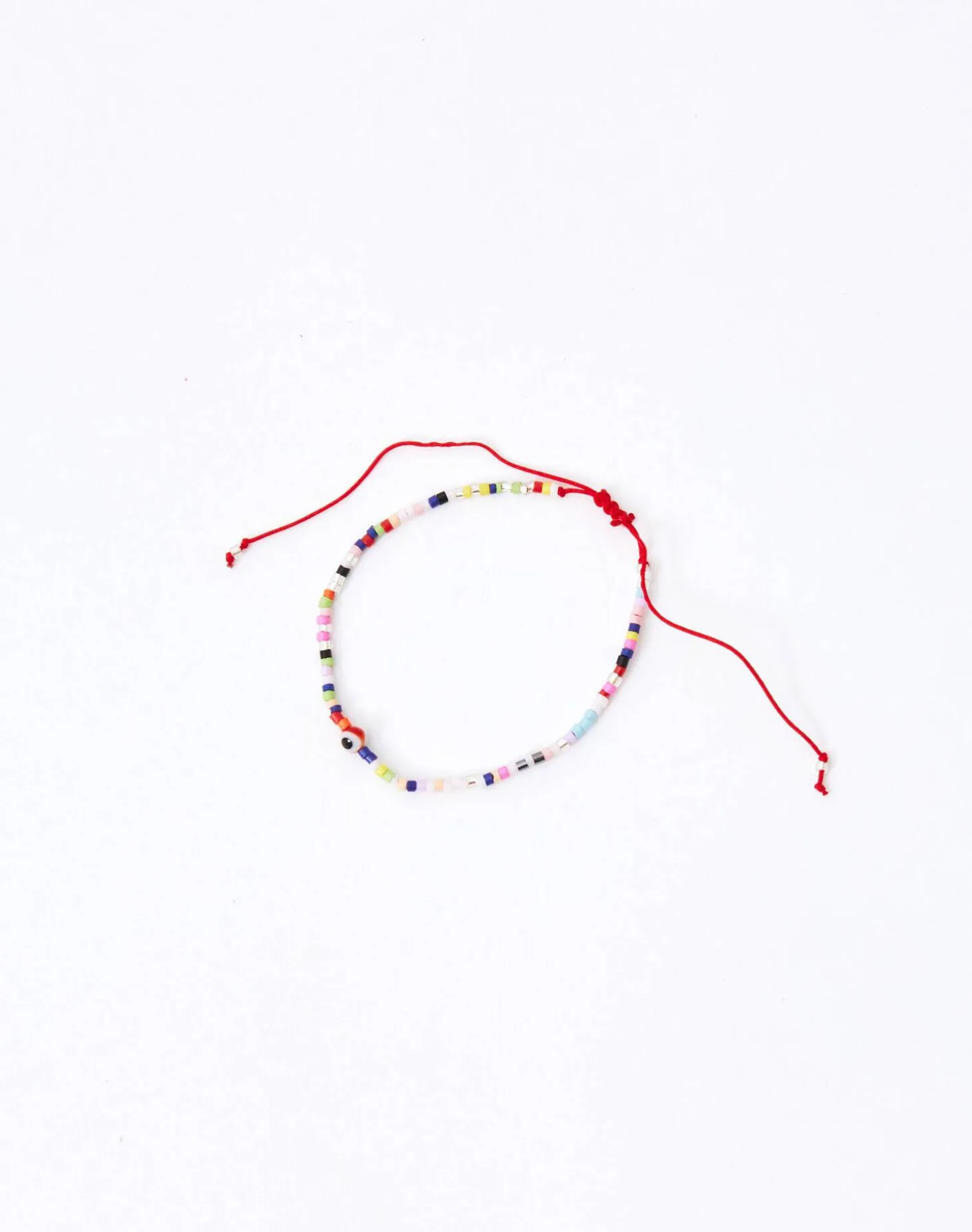 Pulsera de hilo con cuentas de colores y ojo turco. Cierre de nudo corredizo.
