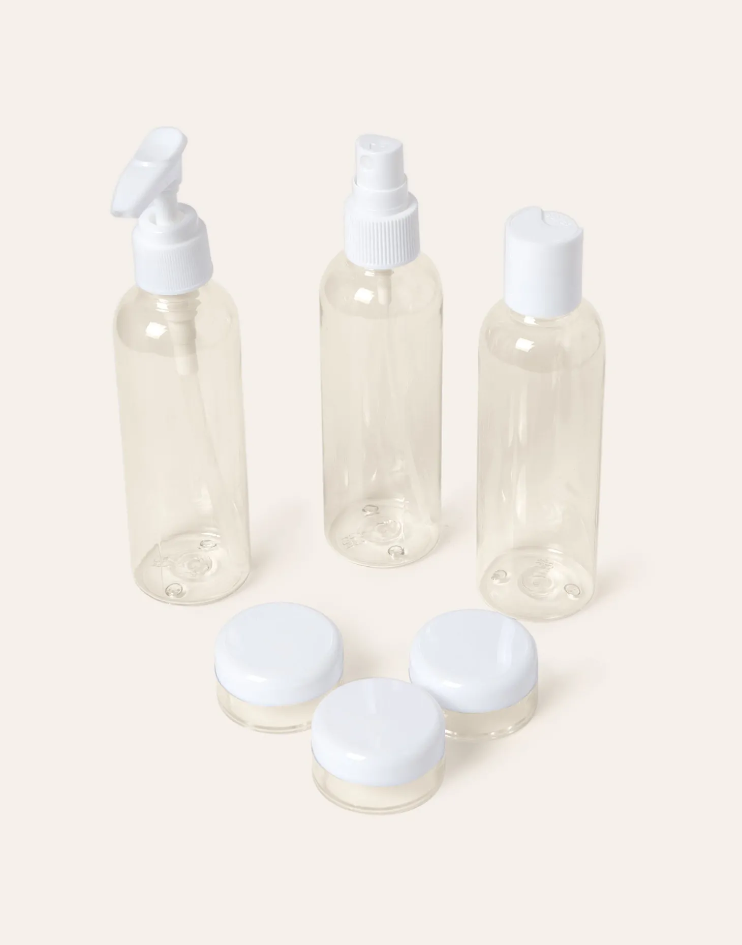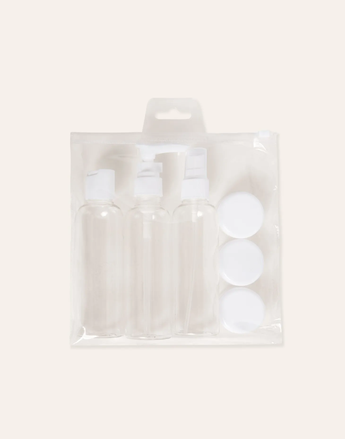 Neceser de viaje con 3 botellitas y 3 botecitos, el kit indispensable en cualquier maleta. Son rellenables, y en ellas podemos transportar muy cómodamente productos de baño, higiene o cosmética. Su tamaño está especialmente pensado para que puedas llevar este accesorio de viaje como equipaje de cabina sin ningún problema.