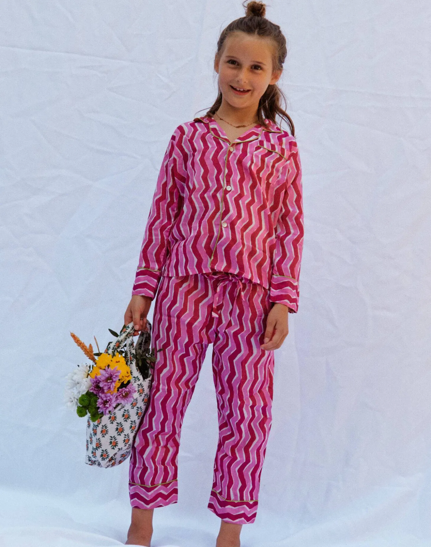 La camisa tiene cuello solapa, bolsillo de plastrón y cierre frontal de botones. El pantalón tiene cintura elástica.