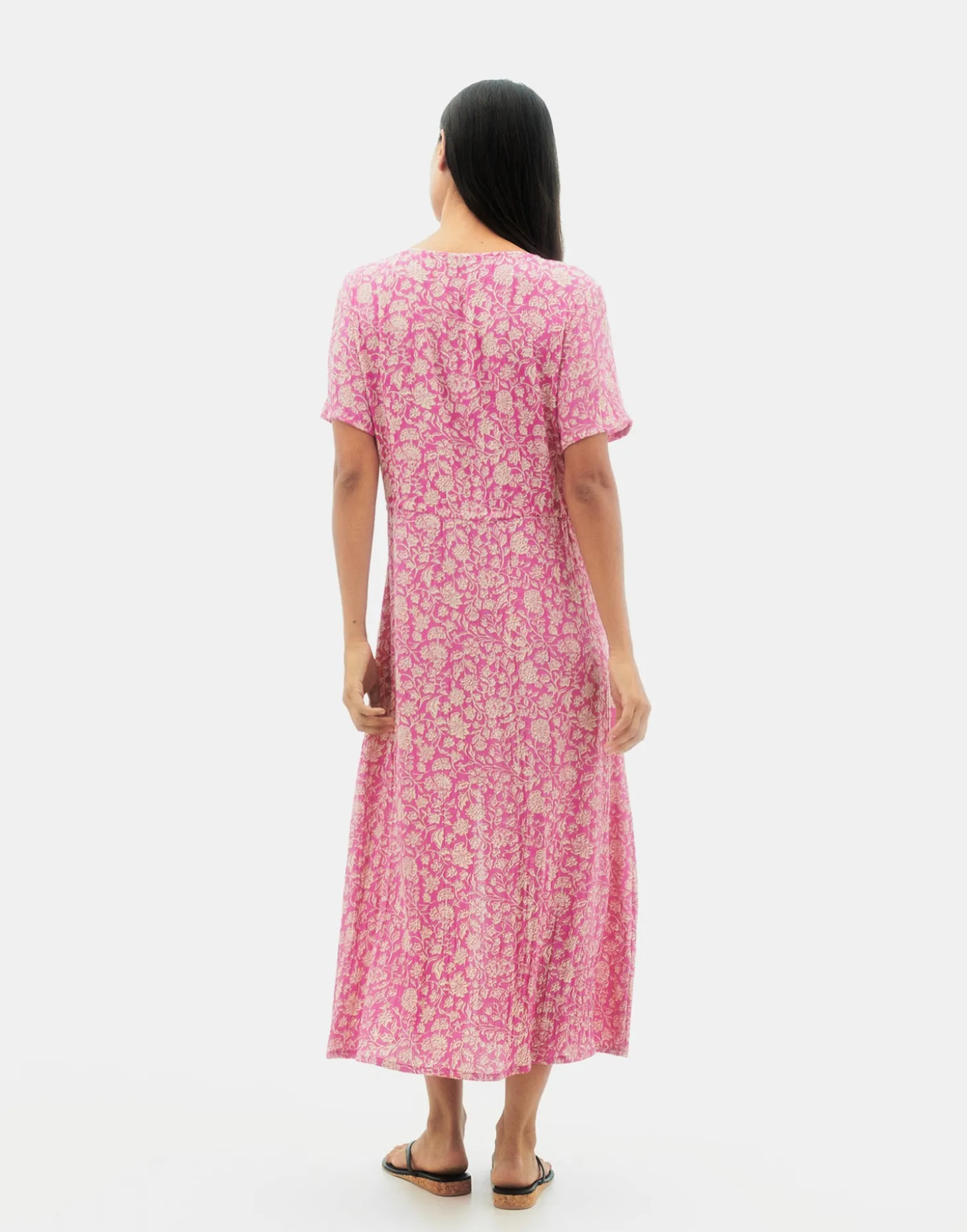 Vestido largo con estampado floral, escote redondo, manga corta y cierre frontal de botones. Cintura ajustable mediante lazo.